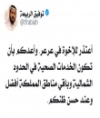 عرعر اليوم ـ رائد الدهمشي : عبر وسيلة التواصل الإجتماعي " تويتر" غرد الدكتور توفيق الربيعة وزير الصحة عن إعتذاره لأهالي عرعر بعدم مقابلتهم اثناء زيارته لمدينة عرعر لإفتتاح عدد من المراكز الصحية كما وعد الربيعة في نفس التغريدة بأن تكون الخدمات الصحية أفضل في منطقة الحدود الشمالية ياتي هذا بعد استياء ..