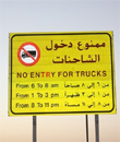 عرعر اليوم ـ رائد الدهمشي : قام مرور منطقة الحدود الشمالية بتركيب لوحات تنبيهية لقائدي الشاحنات فيها مواعيد الدخول للمدينة لتلافي الزحمة وقت الذروة وقد تم توزيع وتركيب اللوحات التنبيهية على جميع مداخل المدينة .