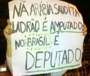 06-28-2013 03:07 PM عرعر اليوم ـ فايز المحيني :تداول مستخدمون سعوديون لمواقع التواصل الاجتماعي، أمس صورة لمتظاهرة برازيلية رفعت لافتة مكتوب عليها "اللص في السعودية تقطع يده، وفي البرازيل يصبح نائب برلمان".