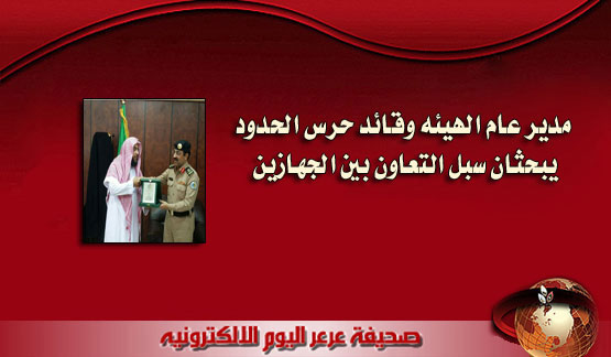 04-07-2014 10:02 AM عرعر اليوم ـ رائد الدهمشي :استقبل فضيلة الشيخ عبدالرحمن المسعود مدير عام فرع هيئة الأمر بالمعروف والنهي عن المنكر بمنطقة الحدود الشمالية بمكتبه هذا اليوم سعادة اللواء/ فالح السبيعي قائد حرس الحدود بمنطقة الحدود الشمالية ، جرى خلال هذا اللقاء مناقشة جملة من الموضوعات المتعلقة بسير العمل ، واستعراض بعض طرق التعاون المشتركة بين الجهازين فيما يخدم الصالح العام ، هذا وفي نهاية اللقاء قدم سعادة اللواء /فالح السبيعي درعاً تذكاري إلى فضيلة الشيخ/ عبدالرحمن المسعود تقديراً لجهود الهيئة بالمنطقة ، وقد حضر هذا اللقاء مساعد مدير عام الفرع الشيخ رعد بن لطيف الرميزان .