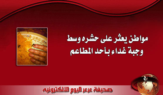عرعر اليوم ـ رائد الدهمشي :عثر مواطن ظهر اليوم السبت على حشره اثناء تناوله وجبة الغداء بأحد المطاعم الشهيره بحي الصالحيه بعرعر والتي هي متخصصه في إعداد وجبة الأرز البخاري وذكر المواطن سطام العنزي أنه تفاجأ بوجودها داخل طبق الغداء اثناء تناوله للوجبه مما يدعو للشك بمدى نظافة المطعم وغيره من المطاعم ايضا مما يوجب على الجهات الرقابيه المسؤوله عن ذلك تكثيف الرقابه على هذه المطاعم لاسيما في فصل الصيف الذي تكثر به الحشرات
