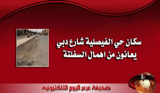 06-10-2014 05:47 PM عرعر اليوم ـ منصور الدهمشي :يعاني سكان حي الفيصليه بشارع دبي في الجهه الشمالية من الحي من إهمال سفلتة الشارع من مده طويله قاربت الشهرين مما يتسبب بإثارة الأتربه بشكل دائم وتجمع المياه كذلك وانعدام المركبات بسبب الحفر مستغربين التقاعس في السفلته دون اي حراك من الأمانه والتي قامت بسفلتت شوارع عده في المنطقه متناسين هذا الشارع مطالبين سرعة التدخل وإنجازه لإنهاء هذه المعاناه للسكان الذين يقعون عليه.