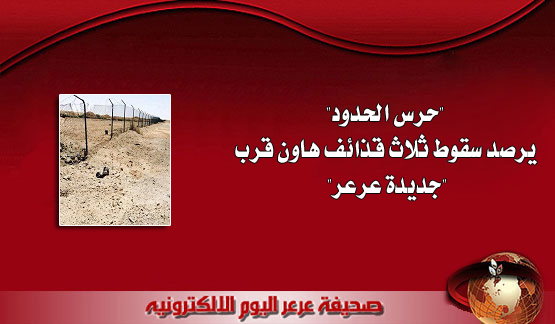 07-07-2014 06:52 PM عرعر اليوم ـ رائد الدهمشي :رصدت قوات حرس الحدود السعودي اليوم سقوط ثلاث قذائف هاون في منطقة صحراوية غير مأهولة بالقرب من مركز جديدة عرعر
