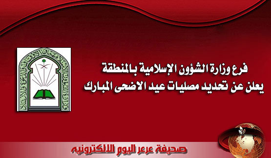 1أعلن فرع وزارة الشؤون الإسلامية والأوقاف والدعوة والإرشاد بمنطقة الحدود الشمالية في مدينة عرعر عن إقامة صلاة عيد الأضحى المبارك لهذا العام 1435 هـ في الجوامع التالية: