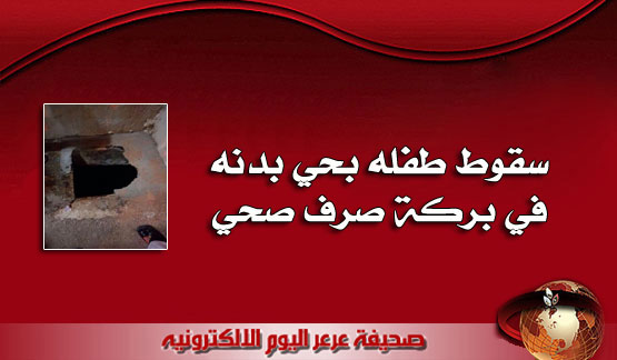 10-18-2014 08:32 AM عرعر اليوم ـ رائد الدهمشي :سقطت طفله تبلغ من العمر 7 سنوات في بركه للصرف الصحي بلغ عمقها ب3 أمتار ونصف بحسب والد الطفله بحي بدنه وقام بإنقاذها عمها في مدة اقصاها دقيقه ونصف وذكر والد الطفله وجد سعد الهزيمي انه فور سقوطها في البركه قام عمها بالنزول في البركه بواسطة حبل وانقذها قبل وصول الدفاع المدني الذي قام بإبلاغه الجيران في حين طالب سعد الهزيمي الجهات ذات العلاقه بالكشف عن البرك المكشوفه قبل وقوع كارثه كحادثة التحليه الشهيره.