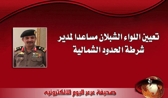11-04-2014 04:59 PM عرعر اليوم ـ رائد الدهمشي :صدر قرار مدير الأمن العام اللواء عثمان ناصر المحرج بنقل اللواء حسن بن عبدالله علي الشبلان من القوات الخاصه لأمن الطرق إلى شرطة منطقة الحدود الشمالية ويعين نائبا لمدير شرطة منطقة الحدود الشمالية إعتبارا من تاريخ 11/1/1436 .