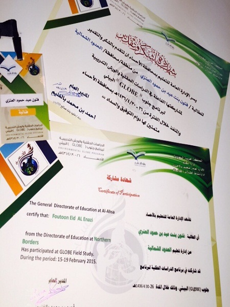 وقد مثلت طالبات فريق جلوب البيئي في منطقة الحدود الشمالية وكانت برفقتها معلمة برنامج جلوب في الثانوية الخامسة بعرعر نوال نايف العنزي وتم منحها شهادة شكر وتقدير من الإدارة العامة للتعليم بمحافظة الأحساء لمشاركتها الفاعلة في البرنامج .