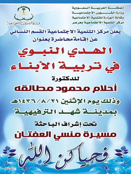 06-08-2015 10:47 AM عرعر اليوم ـ منصور الدهمشي :يعلن مركز التنمية الاجتماعية القسم النسائي بعرعر عن إقامة محاضرة بعنوان الهدي النبوي في تربية البناء للدكتورة :أحلام محمود مطالقه في هذا اليوم الاثنين الموافق 21/08/1436هـ بمدينة شهد الترفيهية تحت إشراف الباحثة : مسيره منسي العفتان