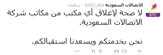 07-26-2015 11:51 AM عرعر اليوم ـ فارس الشملاني :نفت شركة الاتصالات السعودية، في تغريدة عبر حسابها في "تويتر"، صحة ما تردد عن إغلاق وزارة التجارة والصناعة لأحد فروعها بالمملكة.