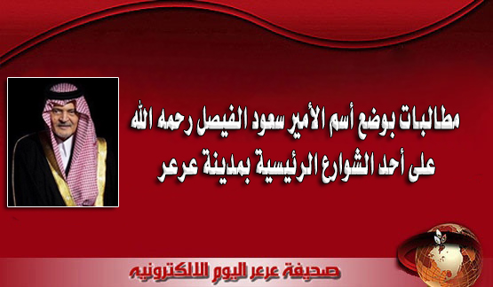 08-03-2015 01:59 AM عرعر اليوم ـ رائد حمد :طالب عدد من المواطنين من اهالي منطقة الحدود الشمالية بوضع اسم الأمير سعود الفيصل رحمه الله على احد الشوارع الرئيسية بمدينة عرعر وكذلك المحافظات التابعه لها نظير ماقدمه من جهد للأمة العربية والإسلامية وذكر المواطن سلمان الشمري ان الراحل يستحق ان يخلد فعله وهذا اقل مايقدم كثير من أسماء الشوارع تحمل اسماء شهداء ورموز لها وزنها فيما قدمت فمن باب اولى وضع أسم سعود الفيصل على احدها وذكر أيضا المواطن عادل العنزي ان كثير من المدن والمحافظات قد وضعت اسم الأمير سعود الفيصل على شوارعها لذلك نقترح على أمانة الشمالية وضعه وفاء وعرفان للراحل يرحمه الله .