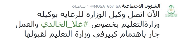 وكتبت "الشؤون الاجتماعية" عبر حسابها الرسمي بموقع "تويتر" في وقت متأخر من مساء يوم الثلاثاء : "الآن اتصل وكيل الوزارة للرعاية بوكيلة وزارة التعليم بخصوص غلا الخالدي، والعمل جار باهتمام كبير في وزارة التعليم لقبولها". 0