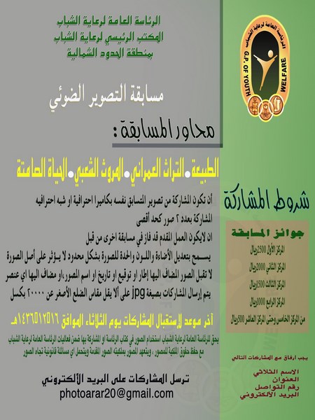 يعلن المكتب الرئيسي لرعاية الشباب بمنطقة الحدود الشمالية عن إقامة مسابقة التصوير الضوئي وذلك ضمن اﻻنشطة الشبابية التي ينفذها المكتب كما صرح مدير المكتب الأستاذ خميس بن رضيمان العنزي انه يحق للجميع المشاركة في هذه المسابقة وفق الشروط الموضحه وستكون الجوائز عبارة عن مبالغ نقدية تمنح للفائزين من قبل اللجنة المشرفة
