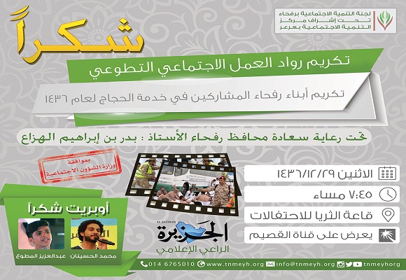 تدعوكم لجنة التنمية الاجتماعية الأهلية بمحافظة رفحاء لحضور حفلها المعد تكريماً للمشاركين في حج هذا العام وذلك على شرف سعادة محافظ رفحاء الاستاذ بدر بن إبراهيم الهزاع يوم الاثنين القادم ١٤٣٦/١٢/٢٩ بعد صلاة العشاء مباشرة في قاعة الثريا للاحتفالات .