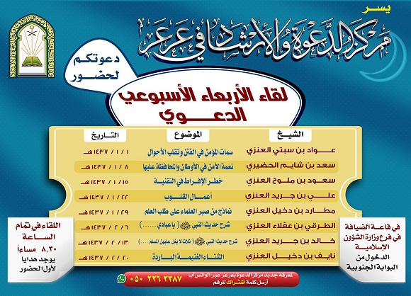 10-14-2015 07:11 PM عرعر اليوم ـ حامد عطالله :يعلن فرع وزارة الشؤون الإسلامية والأوقاف والدعوة والإرشاد بمنطقة الحدود الشمالية عن انطلاق برنامج الأربعاء الأسبوعي الدعوي والذي يشتمل على عدة كلمات ومحاضرات ومسابقات لمجموعة من أصحاب الفضيلة .