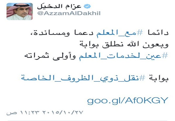 10-27-2015 01:41 PM عرعر اليوم ـ رائد حمد :أعلن الدكتور عزام الدخيل وزير التعليم عبر حسابه في موقع التواصل الأجتماعي " تويتر " عن انطلاق بوابة عين لخدمات المعلم ، وانطلاق بوابة نقل ذوي الظروف الخاصة