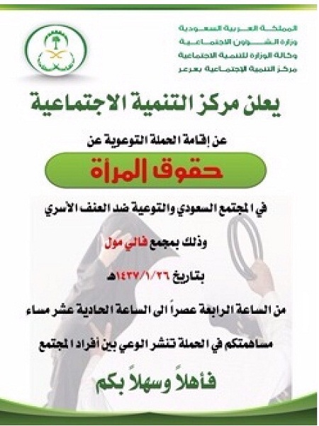11-08-2015 02:40 AM عرعر اليوم ـ رائد حمد :يعلن مركز التنمية الأجتماعية عن إقامة الحملة التوعوية عن حقوق المرأة في المجتمع السعودي والتوعية ضد العنف الأسري وذلك بمجمع فالي مول بتاريخ 26/1/143هـ من الساعة الرابعة عصراً إلى الساعة الحادية عشر مساءاً 0