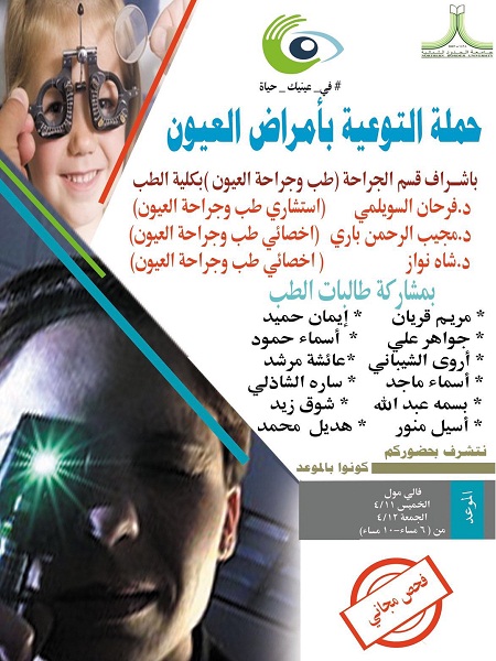 01-19-2016 11:20 PM عرعر اليوم ـ رائد الدهمشي :يقيم طالبات كلية الطب بعرعر حملة التوعية بأمراض العيون بمجمع فالي مول بعرعر وذلك يومي الخميس والجمعة تحت إشراف قسم الجراحة ( طب الجراحة والعيون ) بكلية الطب وسيكون الفحص مجانا لزوار الحملة 1