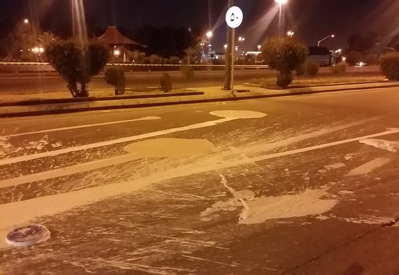 تسبب عدم تأمين شاحنة تتبع لأحد شركات الدهانات لحموله تقلها عباره عن جوالين دهانات الى تساقطها أثناء سير الشاحنه بشارع صلاح الدين بحي مشرف مما تسبب في عرقلة السير وباشر مرور المنطقة الحادثة بتأمين السير لتلافي الضرر الذي قد يقع على المركبات الماره وتولت الشركة مسؤولية تنظيف الاسفلت الذي تغطى بالدهانات