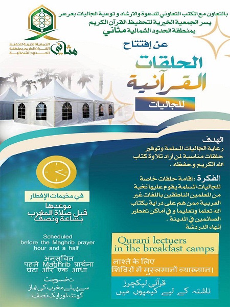 06-10-2016 03:22 AM عرعر اليوم ـ رائد حمد :افتتحت الجمعية الخيرية لتحفيظ القرآن الكريم بمنطقة الحدود الشمالية "مثاني" وبالتعاون مع المكتب التعاوني للدعوة والإرشاد وتوعية الجاليات بعرعر عدد من الحلقات القرآنية في مخيمات الإفطار خلال شهر رمضان المبارك 1437 هـ داخل المدينة .. وسيكون موعدها قبل وقت صلاة المغرب بساعة ونصف .