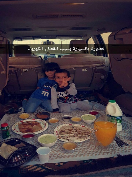 06-25-2016 01:25 AM عرعر اليوم ـ رائد الدهمشي :لجا المواطن محمد المجلاد للإفطار مع ابنائه بسيارته بعد إنقطاع الكهرباء بعرعر الذي دام لساعات طويله متواصله مصادفا خلاله موجة الحر الشديده التي تشهدها المنطقة وذكر المجلاد أنه اظطر الى اللجوء للسياره للتشغيل المكيف ليفطر أبنائه الذين لم تتجاوز اعمارهم السبع سنوات لم يتحملو شدة الحر مما اضطره الى تفطيرهم داخل سيارته . 2