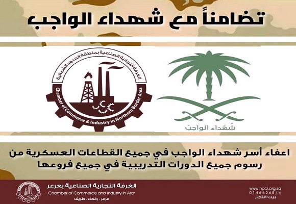 تعلن الغرفة التجارية الصناعية بمنطقة الحدود الشمالية و تضامناً مع شهداء الواجب عن إعفاء أسر شهداء الواجب في جميع القطاعات العسكرية من رسوم جميع الدورات التدريبية في جميع فروعها.