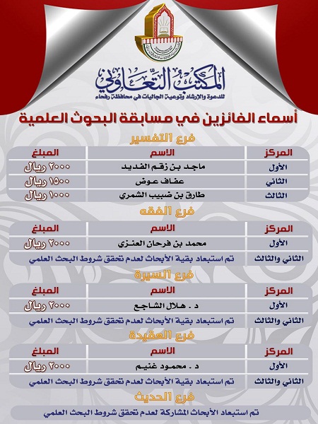 10-24-2016 08:21 PM عرعر اليوم ـ علاقات تعاوني رفحاء :أعلن المكتب التعاوني للدعوة والإرشاد وتوعية الجاليات بمحافظة رفحاء أسماء المفائزين بمسابقة البحوث العلمية.