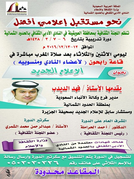 11-30-2016 09:38 PM عرعر اليوم ـ رائد الدهمشي :تنظم اللجنة الثقافية بالنادي الأدبي الثقافي بالحدود الشمالية بالعويقيلة دورة تدريبية ( لأعضاء النادي ومنسوبيه ) بعنوان (الإعلام الجديد) وذلك يومي الاثنين والثلاثاء 6- 7 / 3 / 1438 هـ بعد صلاة المغرب مباشرة ، و التي سيقدمها الأستاذ فهد بن فرحان الديدب مدير فرع وكالة الأنباء السعودية بمنطقة الحدود الشمالية ومستشار سابق للإعلام الجديد بصحيفة الجزيرة وذلك في قاعة رابحون بالعويقيلة . وللتسجيل بالدورة ارسال الاسم الثلاثي على الجوال : 0503030326 . 0