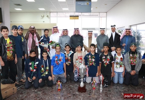 12-04-2016 09:17 AM عرعر اليوم ـ رائد حمد :استقبل مساعد المدير العام للتعليم للشؤون التعليمية الأستاذ عباس بن صالح العنزي بمطار عرعر وبحضور مدير إدارة النشاط الطلابي الأستاذ سليمان بن صالح الحميد ورئيس قسم التربية البدنية الأستاذ خالد بن فهد الشقير ومشرفي التربية البدنية الأستاذ سعد لافي العنزي والاستاذ عبدالعزيز سليمان الخيبري وعدد من مشرفي النشاط بالإدارة وفد منتخب منطقة الحدود الشمالية الفائز بالمركز الأول في البطولة الرياضية المدرسية لكرة والتي أقيمت بمحافظة الإحساء حيث تم تقديم الورود لرئيس الوفد الأستاذ خالد السبعاني والمدرب الأستاذ عبدالعزيز العنزي و للطلاب المشاركين .