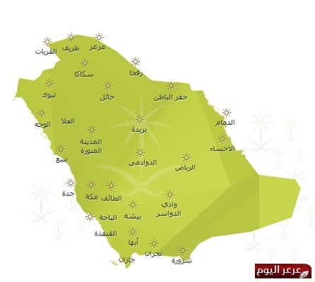 12-14-2016 12:23 PM عرعر اليوم ـ حامد عطالله :تتأثر مناطق الحدود الشمالية، الجوف، تبوك وحائل بنشاط في الرياح السطحية مثيرة للأتربة والغبار يصل متوسط سرعتها إلى 60 كم/ساعة تحد من مدى الرؤية الأفقية قد تصل إلى اقل من 1 كم ،يلي ذلك انخفاض في درجات الحرارة المحسوسة. كما تنشط الرياح السطحية المثيرة للأتربة والغبار تحد من مدى الرؤية على مناطق وسط وشرق وغرب المملكة، في حين تكون السماء غائمة جزئياً إلى غائمة على معظم مناطق المملكة مع فرصة لتكون السحب الرعدية الممطرة على مرتفعات مناطق جازان، عسير، الباحة ومكة المكرمة والأجزاء الساحلية الجنوبية من منطقة مكة المكرمة.