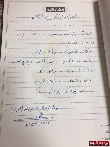 و في ختام جولته في المكتب قال الشيخ الخليوي رأيت من الكرام ما يسر الخاطر و يبهج النفس من نشاط مبارك و عمل منظم فإلى الأمام أيها الكرام والله يتولاكم و يرعاكم