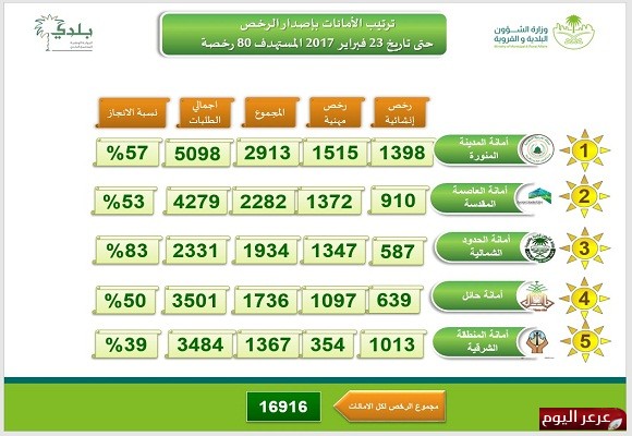 02-26-2017 08:04 AM عرعر اليوم ـ رائد حمد :أوضح المتحدث الرسمي في أمانة المنطقة الاستاذ عبدالعزيز عبدي العنزي أن أمانة منطقة الحدود الشمالية حققت المركز الثالث في إصدار الرخص الإنشائية والمهنية إلكترونياً عبر البوابة الوطنية بلدي.