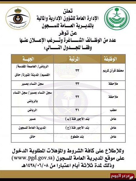 03-06-2017 11:06 AM عرعر اليوم ـ فارس الشملاني :أعلنت الإدارة العامة للسجون عن توفر عدد من الوظائف الشاغرة لديها، بمسميات محفظ قرآن كريم وملاحظة ومعقب وعامل.