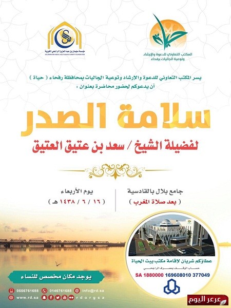 03-14-2017 10:31 AM عرعر اليوم ـ علاقات تعاوني رفحاء :ينظم المكتب التعاوني للدعوة والارشاد وتوعية الجاليات بمحافظة رفحاء ( حياة ) محاضرة لفضيلة الشيخ سعد بن عتيق العتيق بعنوان : " سلامة الصدر " .