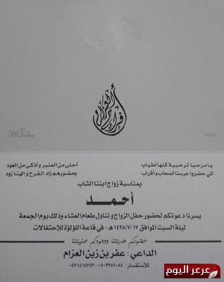 يتشرف عفر زبن العزام بدعوتكم لحضور حفل زواج إبنه " أحمد " وذلك يوم الجمعة ليلة السبت 1438/7/17هـ بقاعة اللؤلؤة للإحتفالات ،،،،