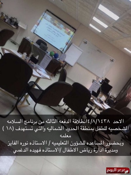05-04-2017 03:46 PM عرعر اليوم ـ فارس الشملاني :انطلق برنامج السلامة الشخصية للطفل في تعليم الحدود الشمالية للمرحله الثالثه وذلك ضمن الشراكة بين وزارة التعليم واللجنة الوطنية للطفولة ومنظمة الامم المتحدة للطفولة “اليونسيف”وبرنامج الخليج العربي للتنمية ” الاجفند” في مرحلة رياض الاطفال والذي يستهدف تعزيز قيم ومهارات السلامة الشخصية لدى الاطفال والقائمين على تربيتهم من معلمات و أولياء أمور من خلال توفير بيئة تربوية صحية وتنمية المهارات الوقائية لمختلف انواع الايذاء والإهمال.