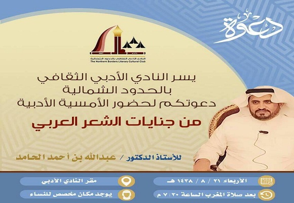 05-17-2017 12:49 AM عرعر اليوم ـ منصور الدهمشي :يستضيف النادي الأدبي الثقافي بالحدود الشمالية سعادة الأستاذ الدكتور / عبدالله بن أحمد الحامد أستاذ الأدب والنقد بجامعة الملك خالد في أمسية أدبية بعنوان " من جنايات الشعر العربي " ، ويدير الأمسية الدكتور فتحي علي خليفي عضو هيئة التدريس بجامعة الحدود الشمالية ، وذلك مساء يوم الأربعاء الموافق 21 / 8 / 1438 هـ بعد صلاة المغرب مباشرة ( 7:30 م) ، بمقر النادي. و يوجه النادي الدعوة لجميع المهتمين بالحضور . مع ملاحظة وجود مكان مخصص للنساء . و الدعوة عامة 0