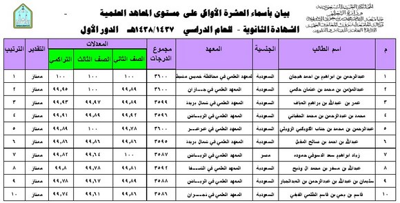 اعتمد فضيلة وكيل جامعة الإمام محمد بن سعود الاسلامية لشؤون المعاهد العلمية الأستاذ الدكتور إبراهيم بن محمد قاسم الميمن أسماء العشرة اﻷوائل في الشهادة الثانوية للمعاهدالعلمية على مستوى المملكة خلال العام الدراسي ١٤٣٧-١٤٣٨هـ .