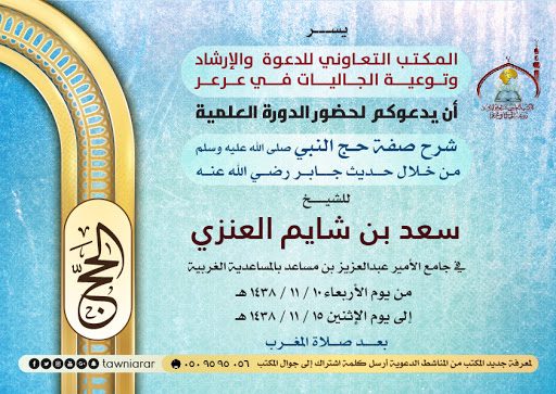 08-02-2017 01:26 AM عرعر اليوم ـ عبدالله المضياني :يسر المكتب التعاوني للدعوة والإرشاد وتوعية الجاليات في عرعر دعوتكم لحضور الدورة العلمية لفضيلة الشيخ سعد بن شايم العنزي في شرحه لصفة حج النبي صلى الله عليه وسلم من خلال حديث جابر رضي الله عنه ومدة الدورة خمسة أيام تبدأ من يوم الأربعاء 1438/11/10هـ بعد صلاة المغرب وتنتهي يوم الإثنين 1438/11/15هـ ، وستقام الدورة بمشيئة الله تعالى في جامع الأمير عبدالعزيز بن مساعد آل سعود بالمساعدية الغربية. 0