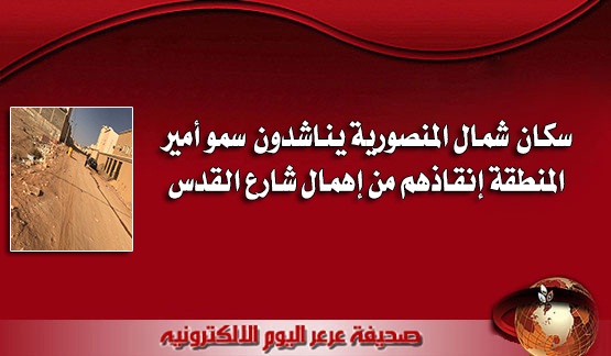 09-30-2017 05:54 PM عرعر اليوم ـ رائد الدهمشي :يعاني سكان حي شمال المنصورية بشارع القدس من إهمال سفلتة الشارع مما يتسبب بإثارة الأتربة بشكل دائم وتجمع المياه الراكده وزيادة الضرر على ساكني الحي مطالبين سرعة التدخل وإنجازه لإنهاء هذه المعاناة للسكان الذين يقعون عليه.