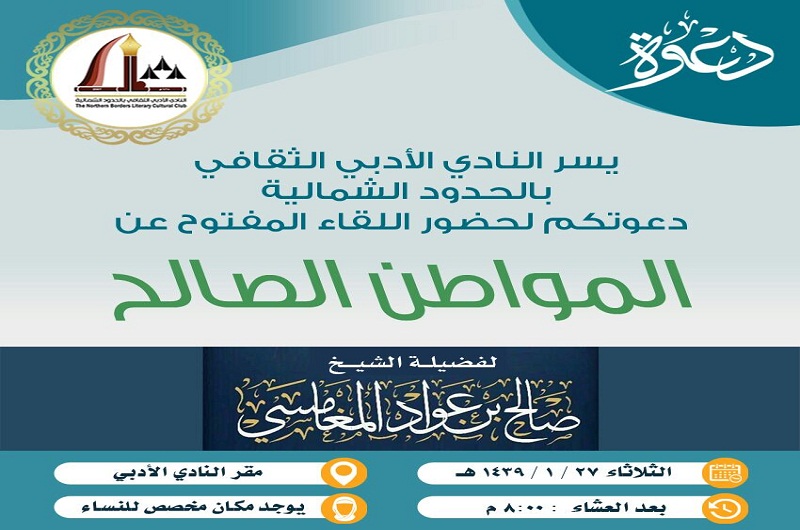 10-16-2017 10:52 AM عرعر اليوم ـ عبدالله المضياني :بتوجيه من صاحب السمو الملكي الأمير فيصل بن خالد بن سلطان أمير منطقة الحدود الشمالية - حفظه الله - يسر النادي الأدبي الثقافي بالحدود الشمالية دعوتكم لحضور اللقاء المفتوح لفضيلة الشيخ صالح بن عواد المغامسي عن " المواطن الصالح " وذلك مساء يوم الثلاثاء 27 / 1 / 1439 هـ بعد صلاة العشاء مباشرة " 8:00 م " بمقر النادي الأدبي .
