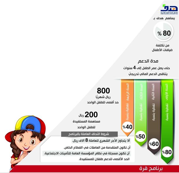 وأوضحت الوزارة أن انضمام طفل المرأة العاملة لبرنامج "قرة" يستلزم ألا يتجاوز عمر الطفل 4 سنوات، وأن يكون سعودياً أو من أم سعودية، وألا يتجاوز الأجر الشهري للعاملة 8 آلاف ريال، وأن تكون المتقدمة من العاملات في القطاع الخاص ومسجلة في نظام المؤسسة العامة للتأمينات الاجتماعية.