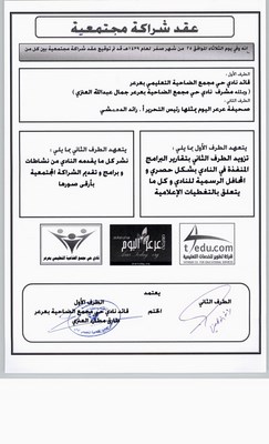 11-22-2017 09:01 AM عرعر اليوم ـ التحرير :وقعت صحيفة عرعر اليوم عقد شراكة إعلامية مع نادي حي مجمع الضاحية بعرعر لنشر أخبار والفعاليات التي يقدمها النادي للطلاب ويأتي ذلك ضمن الشراكات المجتمعية التي يسعى لها نادي الحي يأتي من ضمنها الشراكة الإعلامية حيث تم توقيع العقد من قبل النادي ممثل في مشرف النشاط الثقافي الأستاذ جمال بن عبدالله العنزي وصحيفة عرعر اليوم يمثلها الزميل رائد الدهمشي .