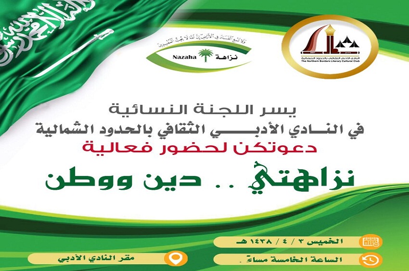عرعر اليوم ـ ابتسام فاضل :تنظم اللجنة النسائية بالنادي الأدبي الثقافي بالحدود الشمالية فعالية بعنوان " نزاهتي .. دين ووطن " وذلك مساء يوم الخميس 3 / 4 / 1439 بمقر النادي.