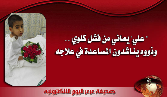 عرعر اليوم ـ رائد حمد :ناشد ذوي الطفل علي نزال العنزي الذي يبلغ من العمر تسع سنوات المسؤولين وأهل الخير علاجه من فشل الكلوي الذي يعاني منه .