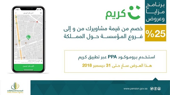 ويمكن لعملاء المؤسسة الحصول على هذا الخصم بإدخال الرمز الترويجي PPA من خلال تطبيق "كريم" على الأجهزة الذكية في الذهاب أو العودة من فروع ومكاتب المؤسسة في المدن المغطاة من شركة "كريم".