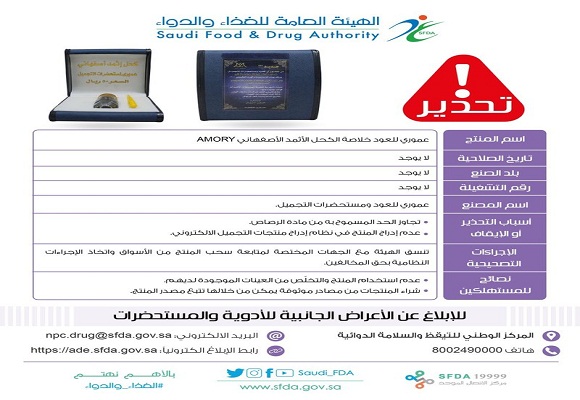 عرعر اليوم ـ فارس الشملاني :حذّرت الهيئة العامة للغذاء والدواء من منتج كحل عيون يحمل اسم "عموري للعود خلاصة الكحل الأثمد الأصفهاني AMORY" لاحتوائه على نسبة عالية من الرصاص، تجاوزت الحدَّ المسموح به.