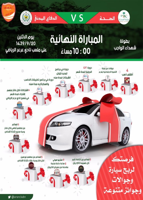 عرعر اليوم ـ رائد حمد :وضعت إدارة نادي عرعر واللجنة المنظمة للبطولة بطولة "شهداء الواجب" الرمضانية للقطاعات والإدارات الحكومية، العديد من الجوائز القيّمة للجمهور الحاضر للمباراة النهائية للبطولة بين فريقي الصحة والدفاع المدني، وذلك يوم الإثنين 20/ 9 الساعة 10 مساء على ملعب النادي الرئيسي .