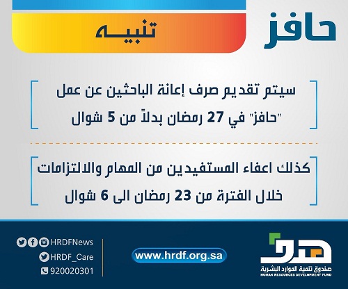 عرعر اليوم ـ سعد شافي :أعلن المتحدث الرسمي لصندوق تنمية الموارد البشرية "هدف"، خالد أبا الخيل؛ تقديم صرف إعانة الباحثين عن عمل "حافز" في 27 رمضان بدلاً من 5 شوال، وكذلك إعفاء المستفيدين من المهام والالتزامات خلال الفترة من 23 رمضان إلى 6 شوال، وذلك نظراً لقرب إجازة عيد الفطر المبارك، ولوقوع موعد صرف الإعانة خلال فترة الإجازة.