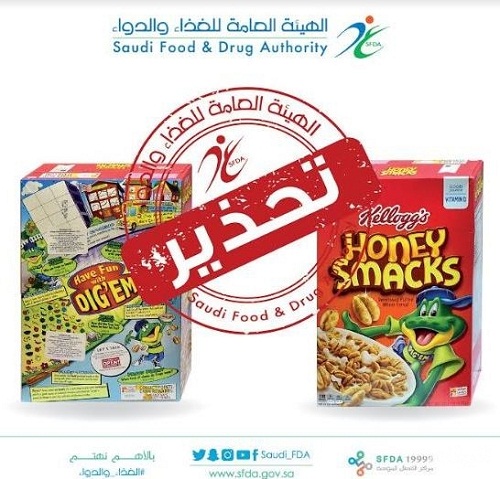 ونشرت الهيئة -عبر حسابها الرسمي على موقع التواصل الاجتماعي "تويتر"- أنها رصدت إنذارًا صادرًا من هيئة الغذاء والدواء الأمريكية (FDA) عن قيام شركة كيلوق Kellogg)) بالولايات المتحدة الأمريكية، بسحب منتج حبوب القمح المنفوخة المحلاة بنكهة العسل (Honey Smacks ® cereal) للعلامة التجارية المشار إليها.