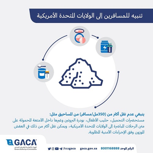 عرعر اليوم ـ منصور الدهمشي :نبّهت الهيئة العامة للطيران المدني، اليوم، عموم المسافرين من المملكة العربية السعودية إلى الولايات المتحدة الأمريكية بعدم نقل أكثر من (350 مل) لكل مسافر من المساحيق (البودرة) داخل الأمتعة المحمولة على متن الطائرة في الرحلات المباشرة المتوجهة إلى الولايات المتحدة الأمريكية.